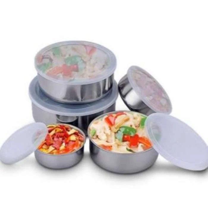 ঢাকনা সহ 5 পিসি স্টেইনলেস স্টিলের ফ্রেশ বক্স • টেকসই অ্যালুমিনিয়াম উপাদান • রান্নাঘর স্টোরেএবং লাঞ্চের জন্য আদর্শ • বহুমুখী এবং সতেজতা রক্ষা করে • যেতে যেতে খাবারের জন্য উপযুক্ত